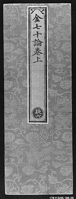 The Sutra Cover by an unknown artist shows a gray rectangle with a floral pattern. A central vertical rectangle features black Chinese characters and a circular symbol. The central rectangle has a thin white border, a thicker black border, and a thin white border. The background rectangle has a thin black border around it.