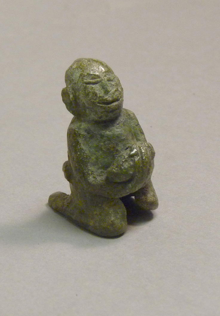 Green stone sculpture of a squatting figure. The figure has a large head with a wide face and closed eyes. The figure has a large nose and a small mouth. The figure is sitting on its heels and its arms are bent at the elbows. The figure's hands are held near its chest. The figure is made of a rough, textured stone. The background is a plain off-white color.