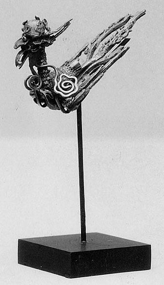 black and white photograph of a silver ornament on a black stand, Ornament, depicting a bird-like creature with outstretched wings and a figure on its back. The creature has a floral pattern on its body and a long beak, mounted on a thin vertical rod attached to a square base.