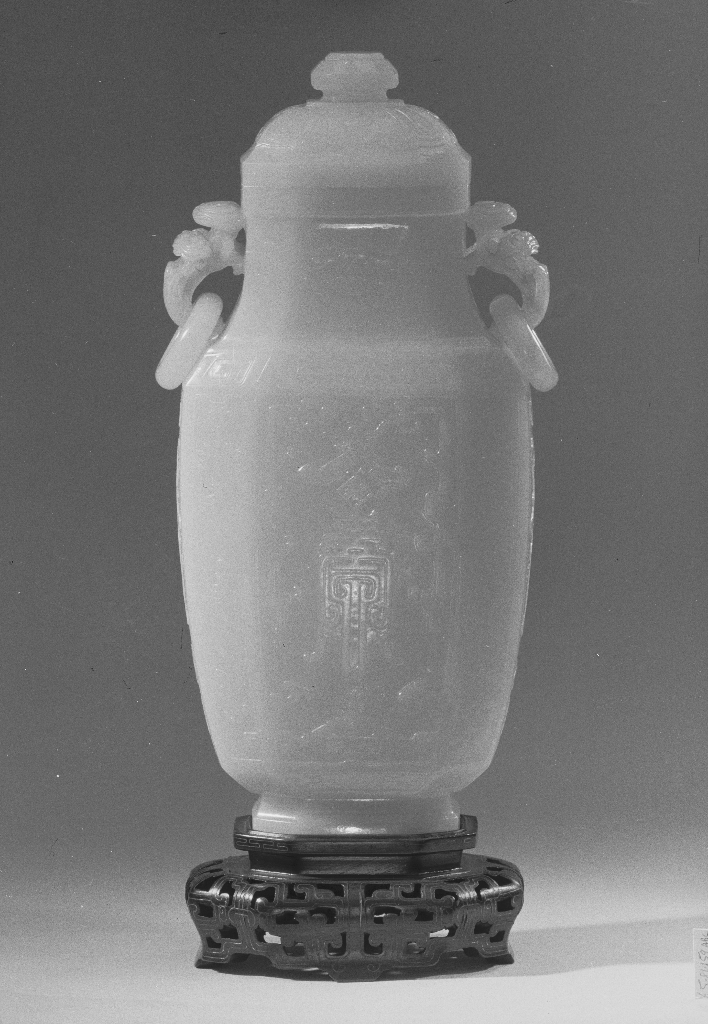 The Covered vase by an unknown artist is a white jade vase with a domed lid. The vase is on a short black stand. The body of the vase is elongated and rounded with a wide base that tapers outwards. The vase has two protruding handles on either side. The handles are curved and end in mythical creature heads. The lid matches the rounded shape of the top of the vase and has a knob on top. The background is dark on the top half transitioning to light on the bottom half.