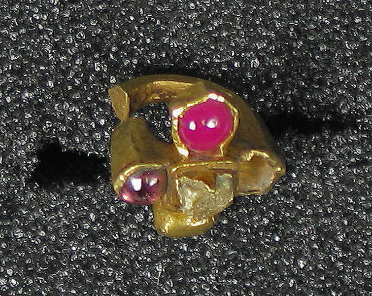 Gold earring with quatrefoil shape, featuring two round rubies. The top ruby is larger and positioned above the smaller one on the bottom left. The earring appears to be made of gold with a textured surface. The background is black and textured, resembling a sponge or foam.