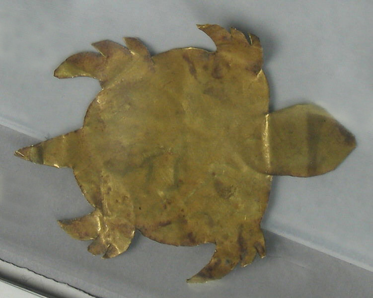 Gold-colored metal object in the shape of a turtle; head to right; four legs and tail visible; on white background; on flat surface, possibly glass. Turtle Votive Offering; Artist not specified.