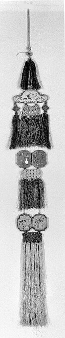Vertical hanging object with a thin string at the top. The object consists of multiple sections. The top section has a small black tassel. Below it is a metal piece with a decorative design, followed by a longer black tassel. A metal piece with a geometric pattern comes next, then another black tassel. Below that is a metal piece with a design, and finally, a long gray tassel at the bottom. The title is "Small Hanging" and the artist is not specified but presumably associated with this object is Agnes Martin.