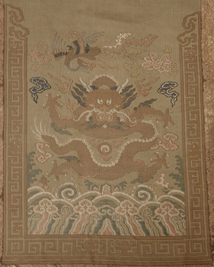 Brown-colored fabric with intricate design, featuring a dragon and a phoenix surrounded by flowers and clouds. Tan background with a border on both sides consisting of interconnected squares forming a continuous line. The border at top and bottom features a wave design with pinkish flowers. Dragon depicted in shades of brown with white eyes and blue and white accents on wings. Phoenix rendered in brown with white and blue details on wings and tail. Pink and white flowers scattered around. Lower section shows stylized waves in shades of pink, blue and white. Title: Piece. Artist: Unspecified.