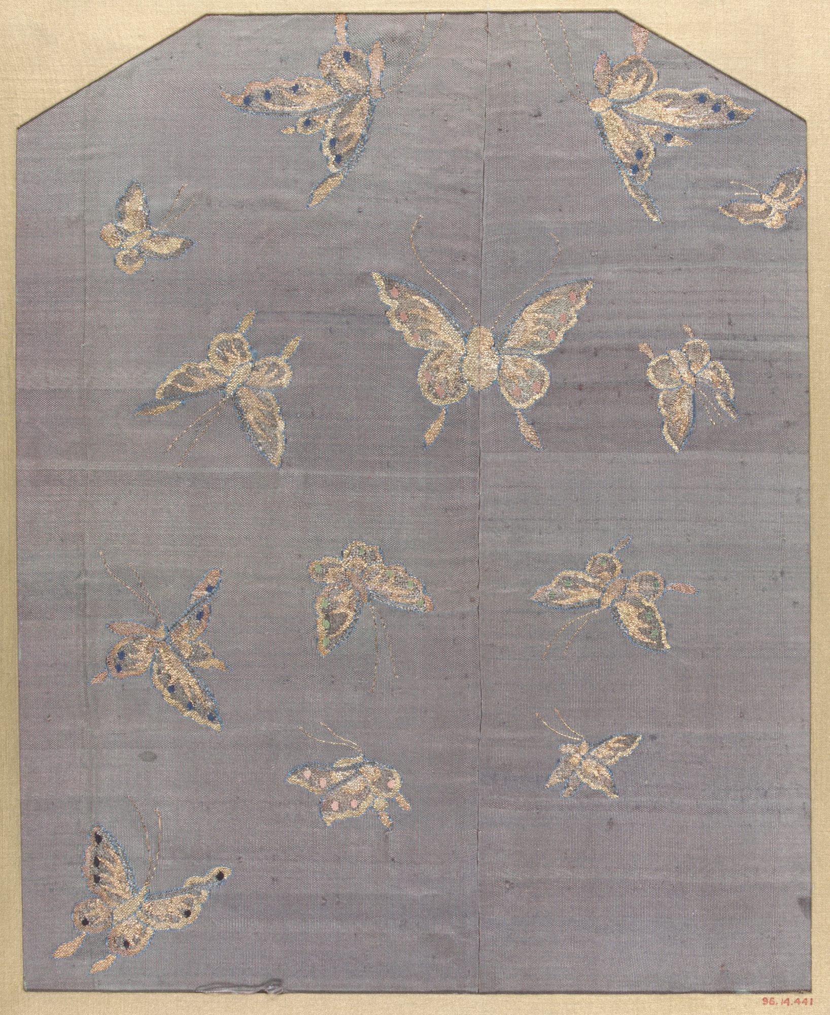 Gray background with octagonal shape, gold-colored butterflies with some blue and orange details scattered across, thin gold border around edges, artist's small signature in bottom right corner. Piece by Itō Jakuchō.