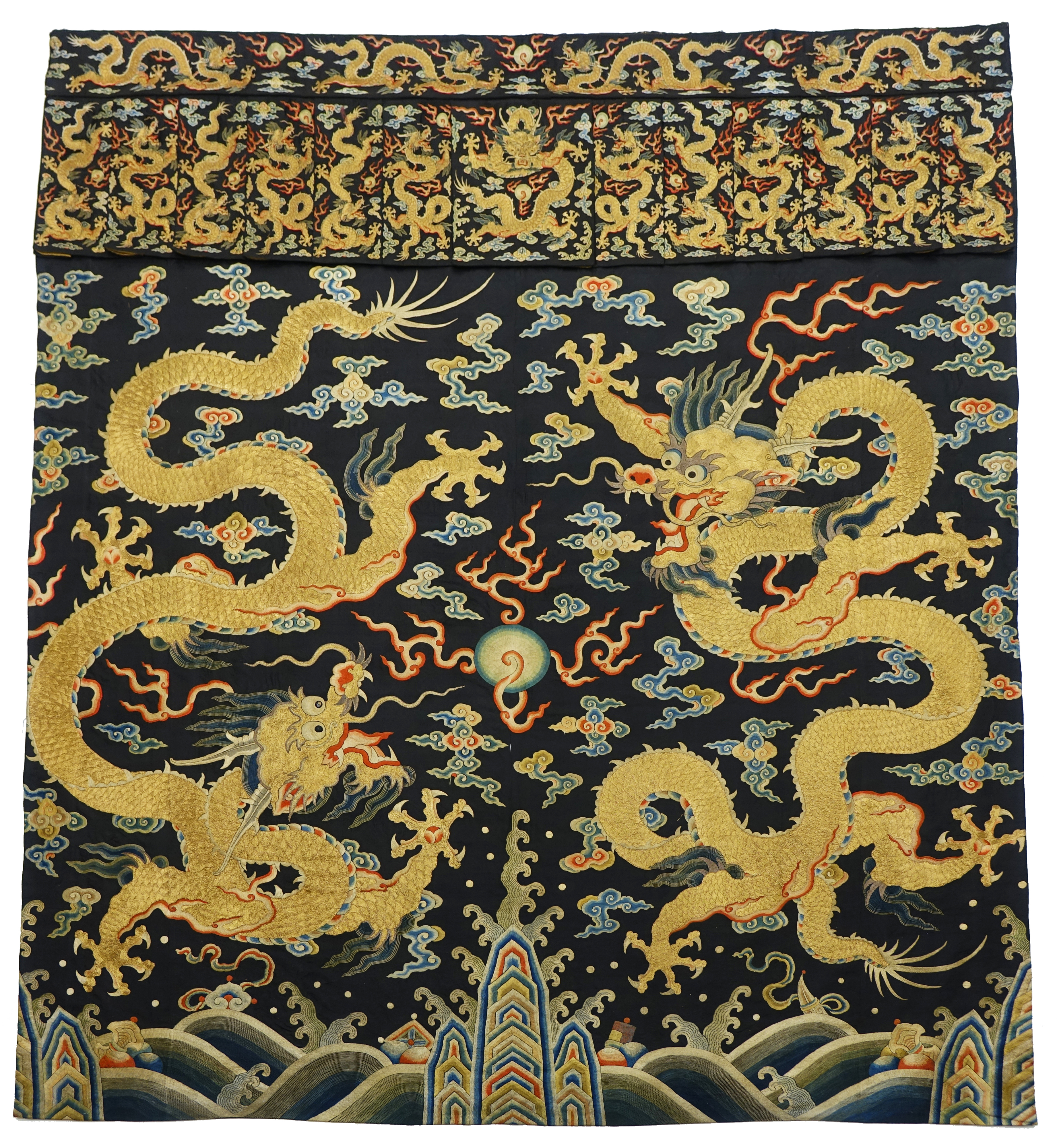 Black silk fabric with gold, blue, orange, and white designs. Two large gold dragons with orange and blue highlights on their bodies, facing each other, and surrounded by white and orange clouds. The dragons have five claws, and their bodies are intricately detailed. The top of the fabric features a gold, blue, orange, and white patterned border with dragons and other designs. The bottom of the fabric has a blue and gold wave-like pattern. The fabric is titled "Hanging" and is by an artist whose name is not specified.