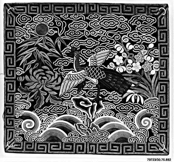 Black square with white design. Border of keystone-like geometric pattern. White clouds throughout. Sun or circle left of center top. Peacock facing right; body curved down; head and neck curved up, beak pointing up. Tail feathers extend to right; some tail feathers have eyes. Greenery and flowers on left and right.