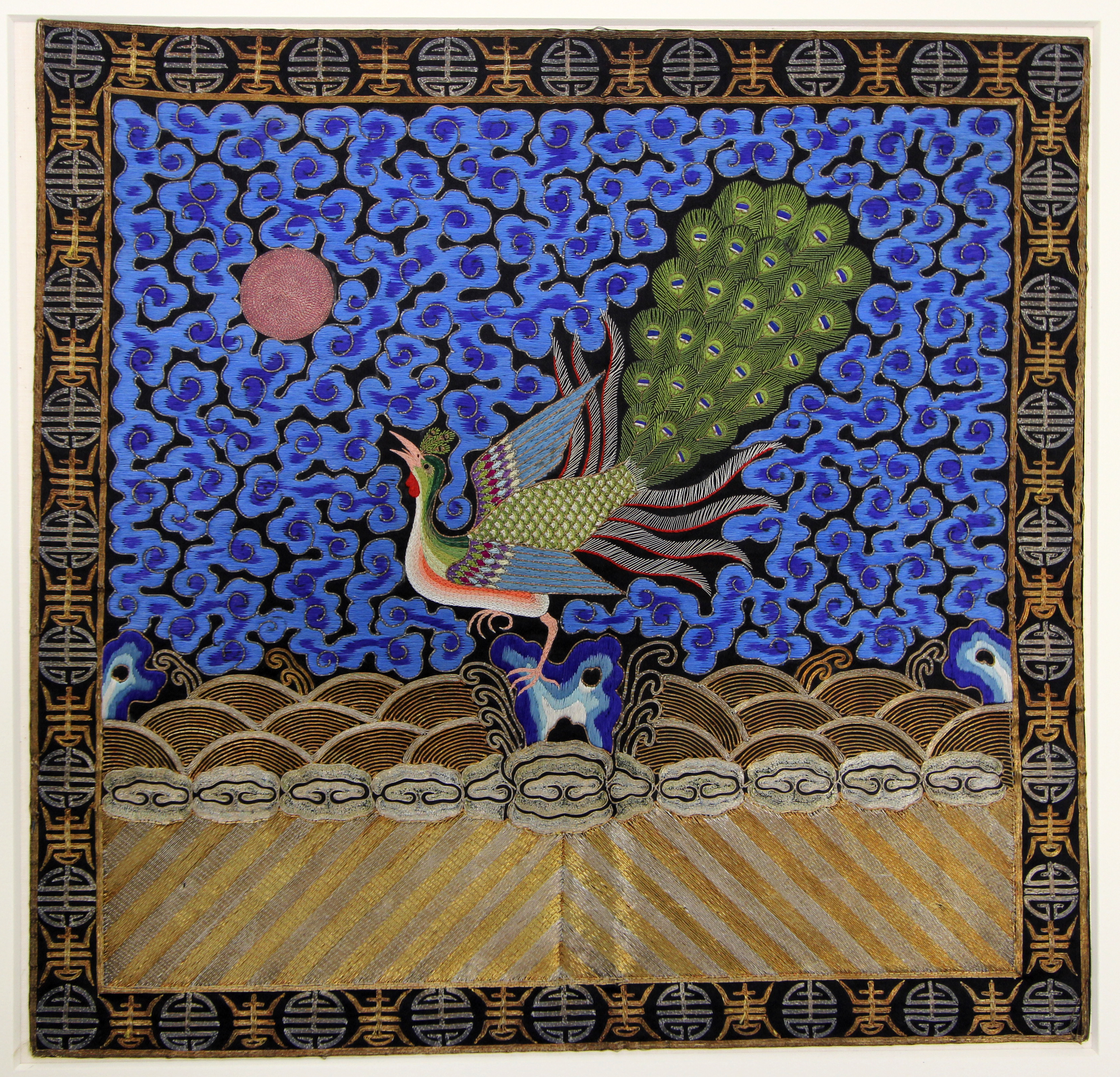 Square artwork with a peacock. The peacock has a green head, blue and green tail feathers, and a body with pink, white, and green. The peacock stands on a brown and gold ground with wave-like designs. The background is blue with small blue flowers. A pink sun is in the top left. The artwork has a black, gold, and gray border with Chinese characters. The artwork is by an artist known for "Rank Badge with Peacock".