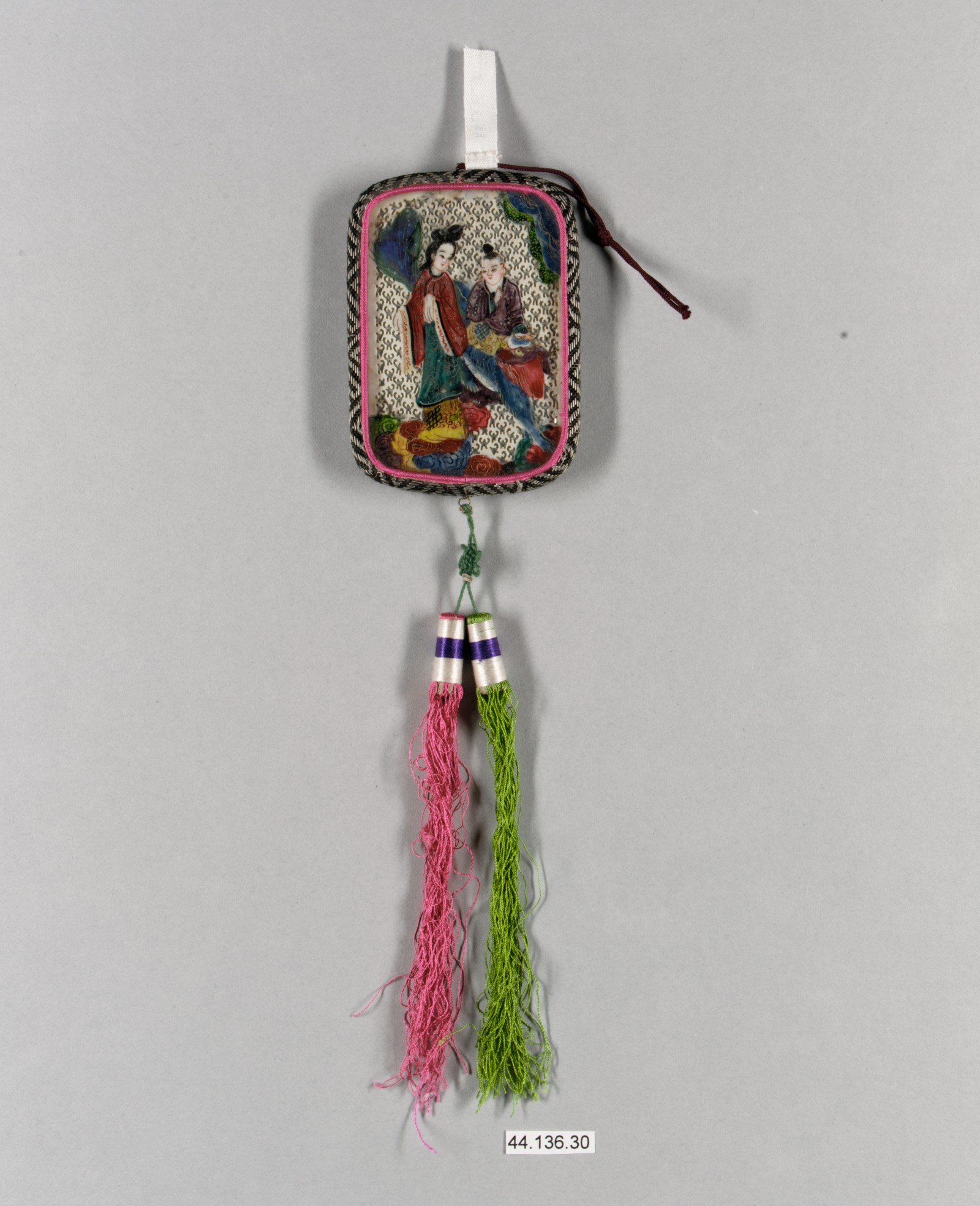 The image shows a square-shaped object titled "Mirror" by an artist whose name is not specified. The object is black with a pink border and a colorful design depicting two people in traditional clothing. The object has a white ribbon attached to the top and a brown ribbon on the right side. Below the object is a green cord with a tassel made of pink and green threads, and two silver beads. The background of the image is gray.