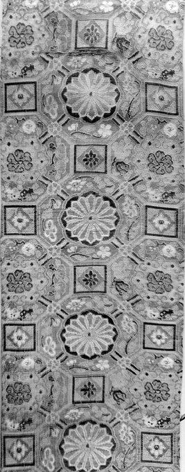 Black and white image of a rug with repeating floral patterns. The rug is rectangular. The pattern consists of three large floral medallions, each surrounded by four squares. The medallions and squares are arranged in a repeating pattern across the rug. The background of the rug is light-colored. The medallions have a flower-like shape with multiple petals. The squares have a solid border. Small floral motifs and other designs are scattered throughout the rug.