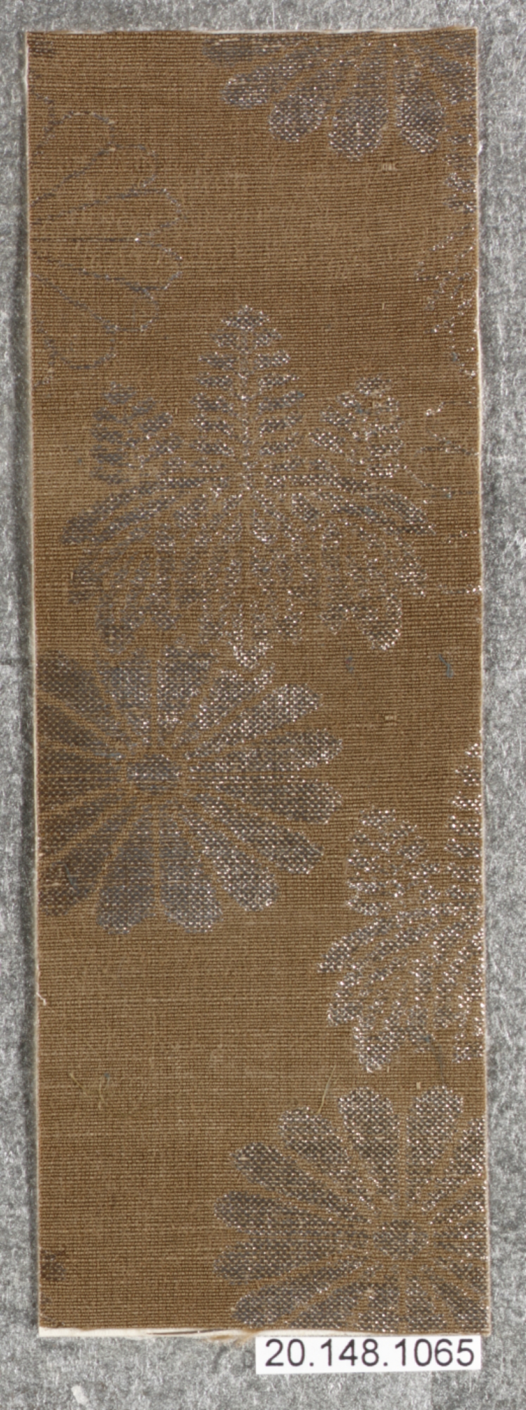 Brown piece with a thin white border. The piece contains four flower-like designs. Starting from the left are two full flower designs directly next to each other. The left design contains eight petals. The right design contains seven petals. There are two half-flower designs on the right side. The top half-flower contains four petals and the bottom half-flower contains five petals. The background of the piece is plain brown while the designs are a lighter brown. The piece by artist "Beatrice Wood". The piece is titled "Piece".