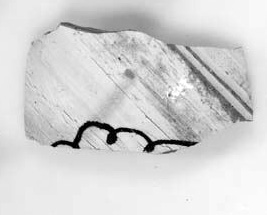 Shard by artist [unknown]. A broken white pottery shard with curved edge on the left and jagged edge on the right. Black line drawing of a cloud-like shape at the bottom. Diagonal lines going from bottom left to top right. Background is white.