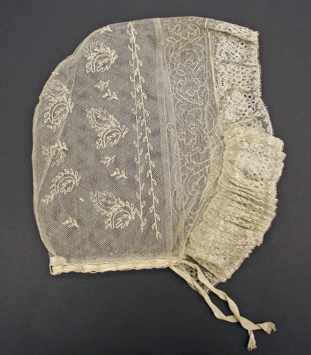 The image is of a beige lace fan. The fan is semi-circular in shape. The left side has a floral pattern with a mesh-like texture. A solid panel runs down the center. The right side features a more intricate lace design with a ruffled edge. A long, thin ribbon extends from the bottom for tying. The background is dark gray. The fan is titled "Cap" by an unknown artist.