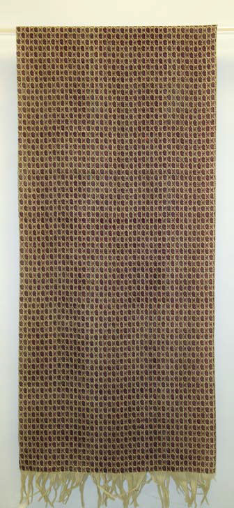 Brown shawl with a repeating pattern of small circles. The circles are light brown with darker brown outlines. The shawl hangs from a beige rod. The bottom of the shawl has short, light brown tassels. The shawl fills most of the image. The background is white.