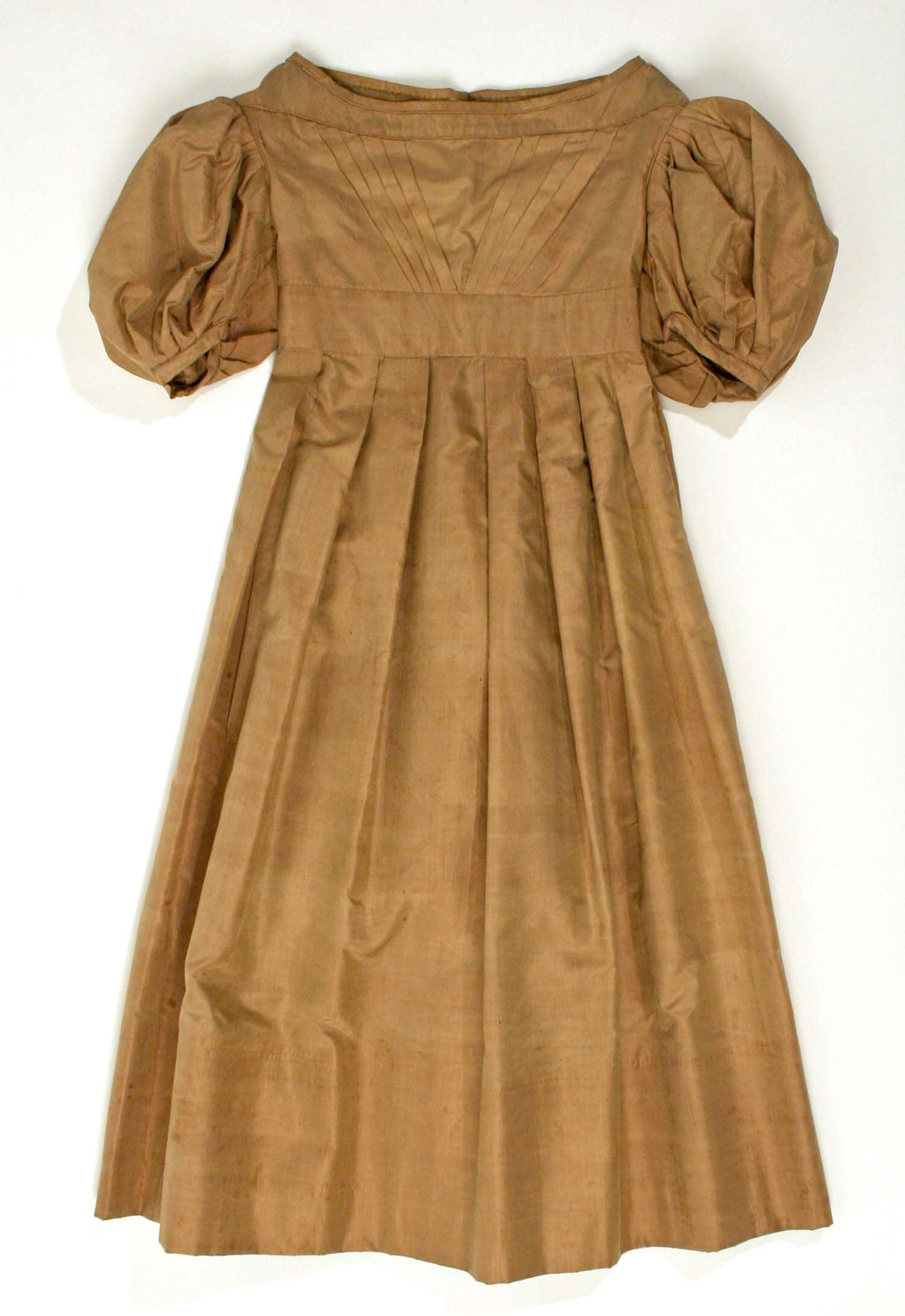 Tan-colored dress with short sleeves, square neckline, and pleated skirt, featuring gathered puffy sleeves, a fitted bodice with pleats at the top, and a flared skirt that falls below the knee. The artist is Louise Bourgeois and the title is Dress.