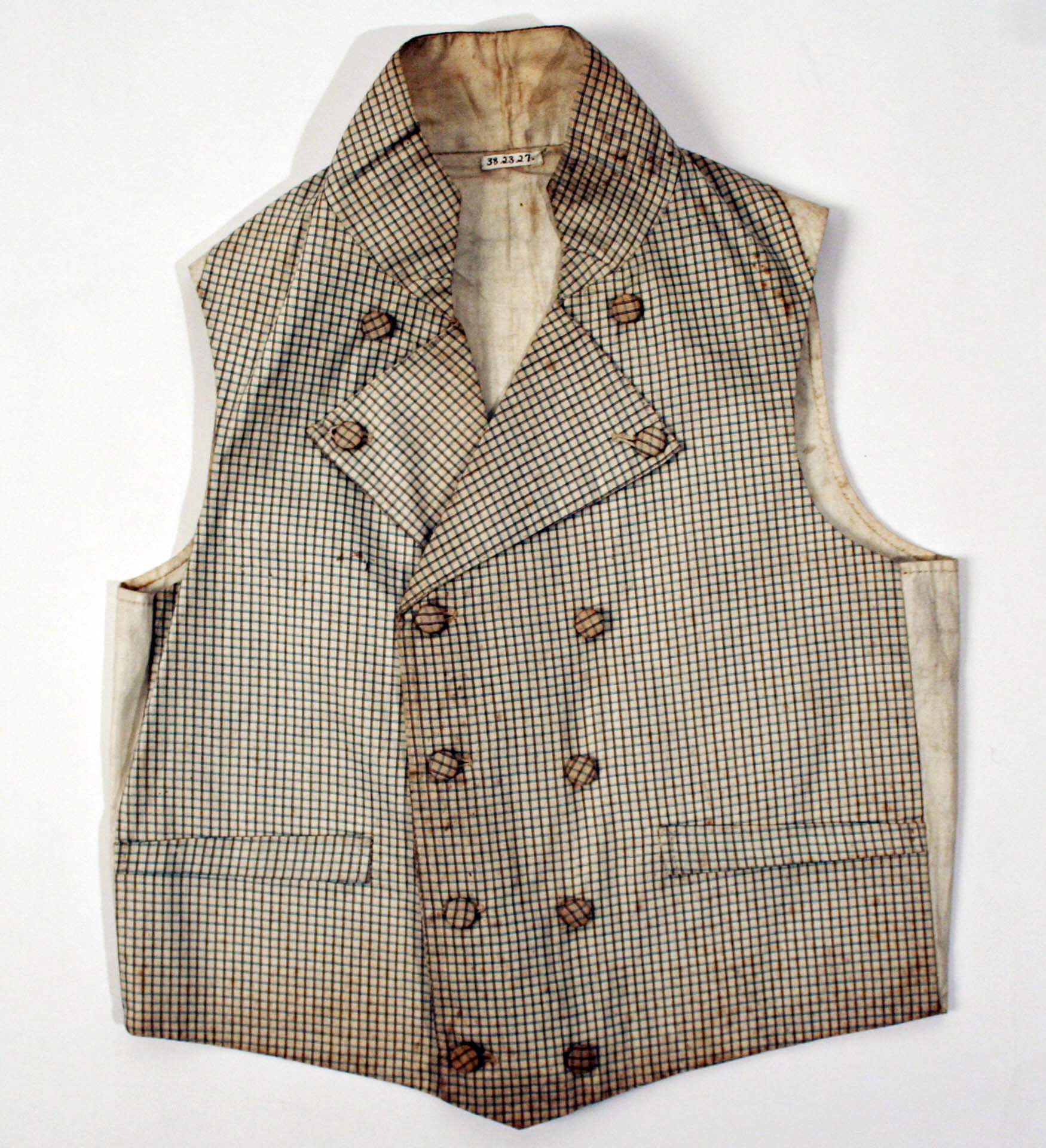 Tan vest with black and red check pattern; lapels and six buttons; pockets on either side; dirty beige lining; button holes on left side; six buttons on right; stains on lapels and lining; pointed bottom; shoulder pads. Vest by Peck.